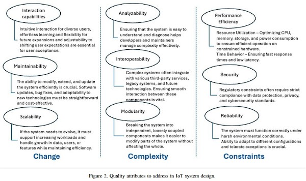 IoT-järjestelmien suunnittelussa keskitytään usein siihen, mitä järjestelmän pitää tehdä – esimerkiksi mitata lämpötilaa. Mutta yhtä tärkeää on, miten järjestelmä toimii: onko se turvallinen, helppokäyttöinen, nopea ja luotettava? Ohjelmistokehityksessä näitä kutsutaan ei-toiminnallisiksi vaatimuksiksi eli laatutekijöiksi. IoT-järjestelmistä puhuttaessa tiettyjen laatuominaisuuksien merkitys korostuu entisestään. Sensoriverkko voi esimerkiksi koostua hyvin erilaisista laitteista, joilla kullakin on oma elinkaarensa, joten järjestelmän ylläpidettävyyteen ja laajennettavuuteen on kiinnitettävä erityistä huomiota.