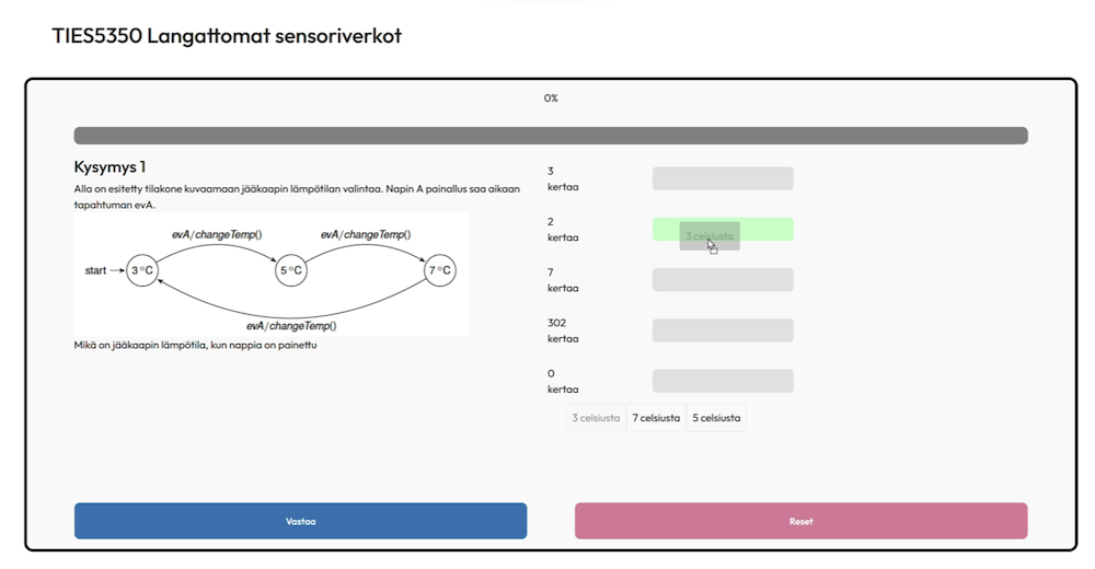 Interaktiivisuustyökalua pilotoitiin kevätlukukaudella 2025 Langattomat sensoriverkot -kurssilla. Pilottikäytön aikana ja sen jälkeen saimme palautetta opiskelijoilta ja työkalua on paranneltu näiden palautteiden perusteella.