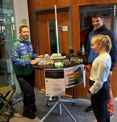 Samat esittelylaitteet tavoittivat yleisöä myös viime viikonlopun Kokkolan suunnistajien järjestämissä sprinttikisoissa, missä Kokkolan yliopistokeskuksen tilat toimivat kisakeskuksena. Epävakainen sää varmisti yleisön tauoilla sisätiloissa, missä kisajärjestäjänä toiminut projektipäällikkö Hongell jatkoi laitteiden esittelyä.